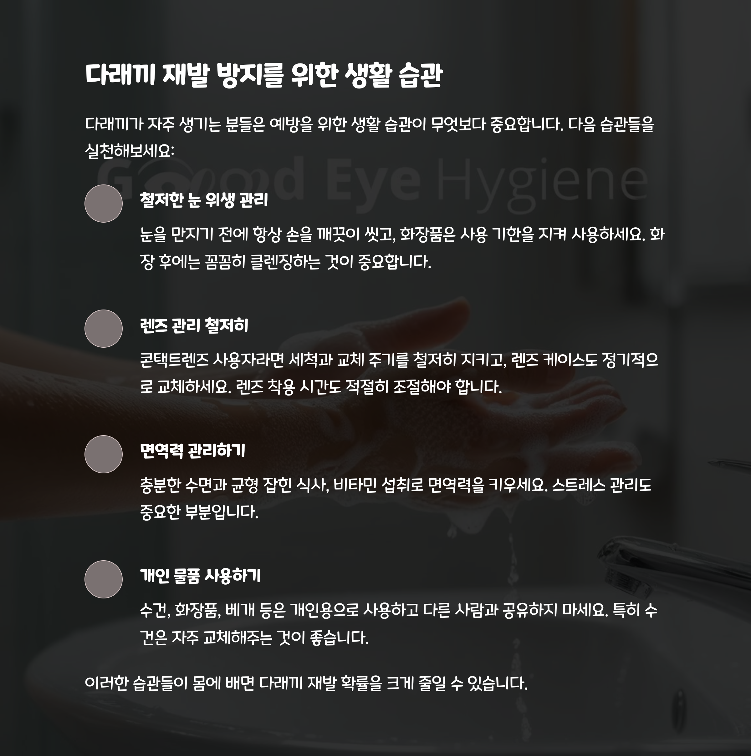 다래끼가 잘 생기는 분들은 눈 청결이 정말 중요해요. 렌즈 착용 전후 손씻기는 필수고, 아이 메이크업 후 깨끗하게 클렌징하는 것도 잊지 마세요. 그리고 무엇보다 중요한 건 면역력 관리랍니다.