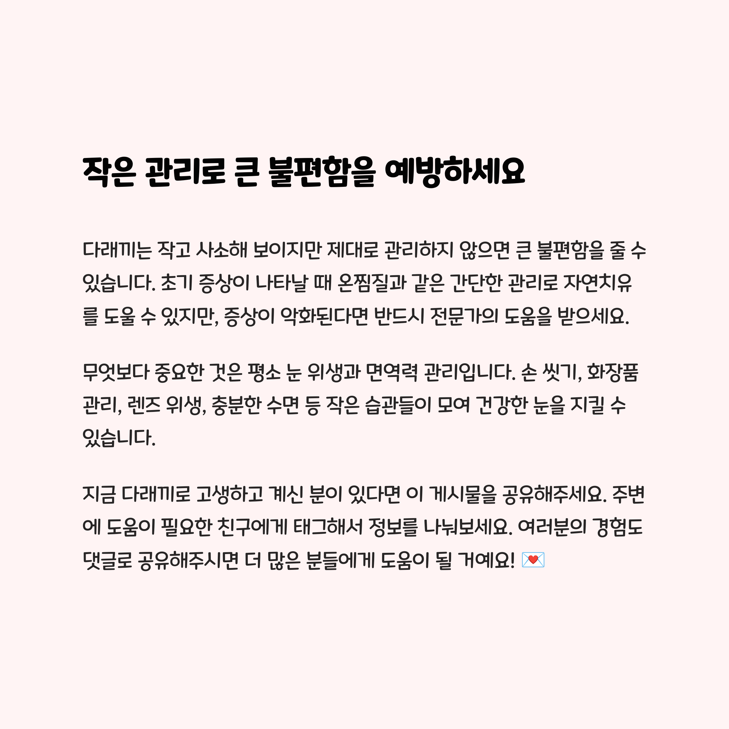 다래끼, 작고 사소해 보일 수 있지만 신경 안 쓰면 고생길이 열려요. 저도 초기에 소홀히 했다가 더 크게 붓고 결국 병원에 다녀왔거든요. 가장 좋은 건 면역 관리와 청결, 그리고 이상 증상이 느껴질 때 바로 대처하는 거예요. 이번 글이 도움이 되셨다면, 여러분의 경험도 댓글로 남겨주세요. 함께 나누면 건강 관리가 훨씬 쉬워지니까요!