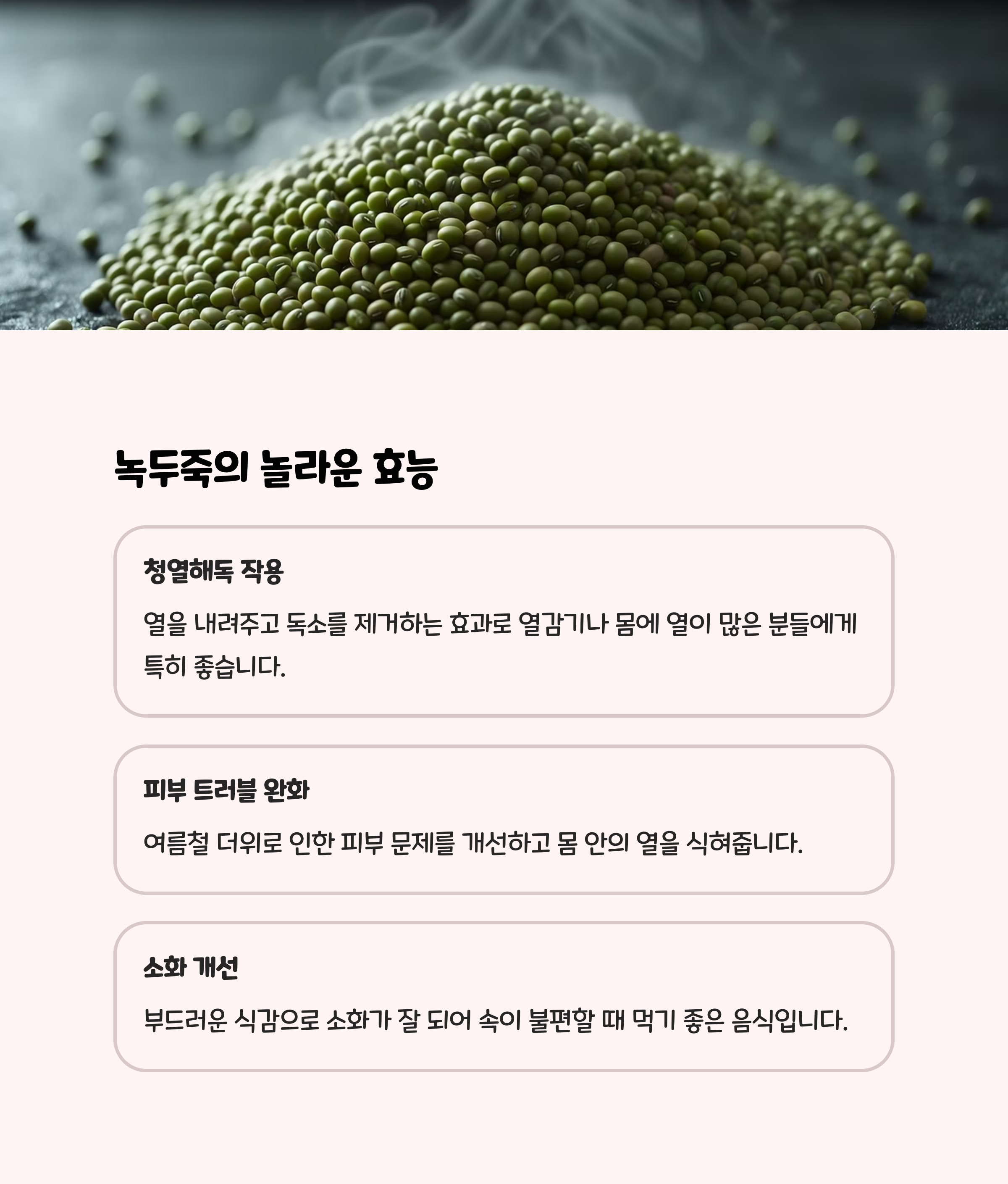 녹두죽, 그냥 밥 대신 먹는 죽이 아니라는 거 이제 아시겠죠? 열을 내려주고 해독까지 해주는 건강한 음식이지만, 내 몸 상태에 따라 잘 맞춰서 먹는 게 제일 중요해요. 특히 여름철 무더위로 지쳤을 때, 속 편하게 한 끼 챙기고 싶을 때 강추드려요. 다음번엔 녹두죽 외에 여름 보양식으로 인기 있는 재료들도 소개해볼게요. 궁금한 게 있다면 댓글 남겨주세요 😊