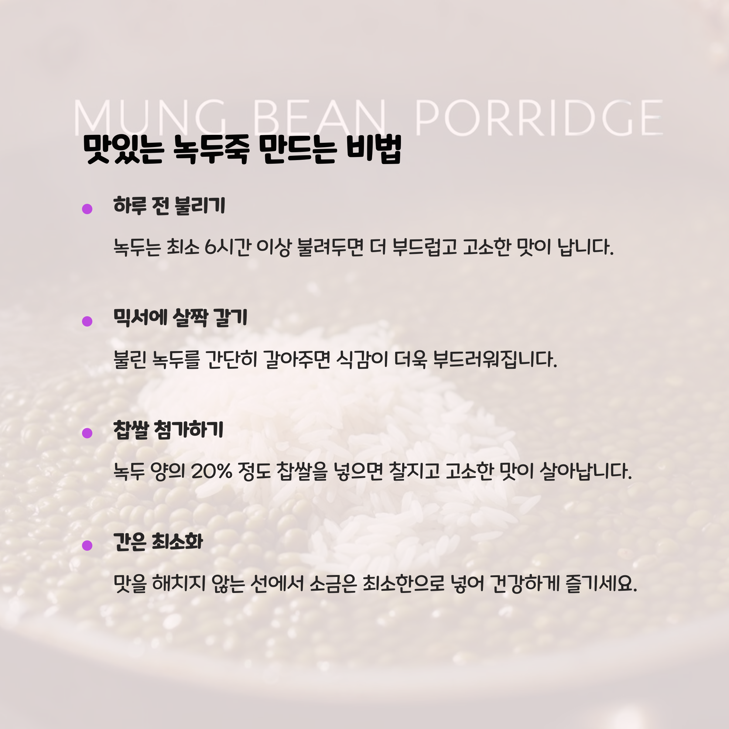 저는 녹두죽 끓일 때 꼭 하루 전에 녹두 불리기부터 시작해요. 그래야 훨씬 부드럽고 고소하거든요. 아래 팁대로 해보시면 집에서도 간단하게 깊은 맛을 낼 수 있어요.