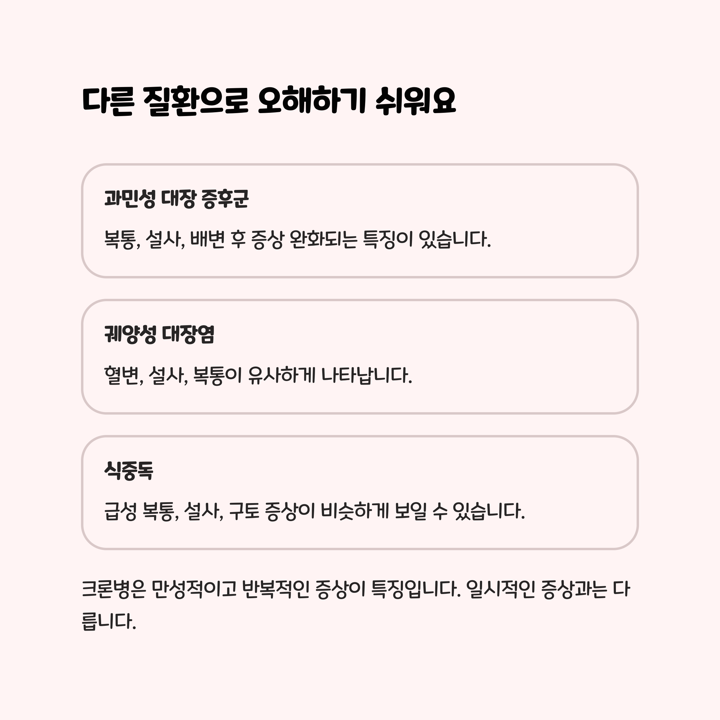 장염은 급성이고 비교적 금방 낫지만, 크론병은 만성이고 반복적인 경향이 강해요.