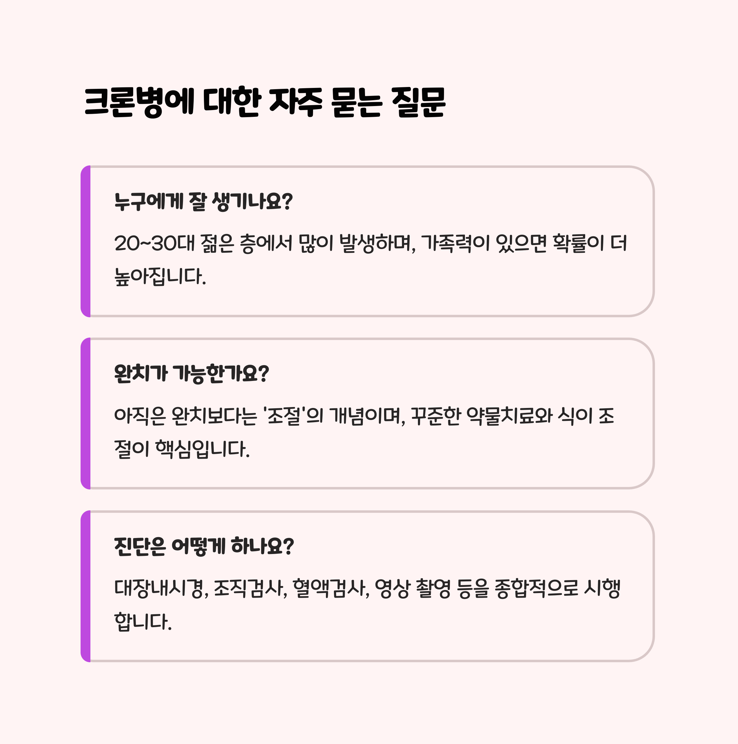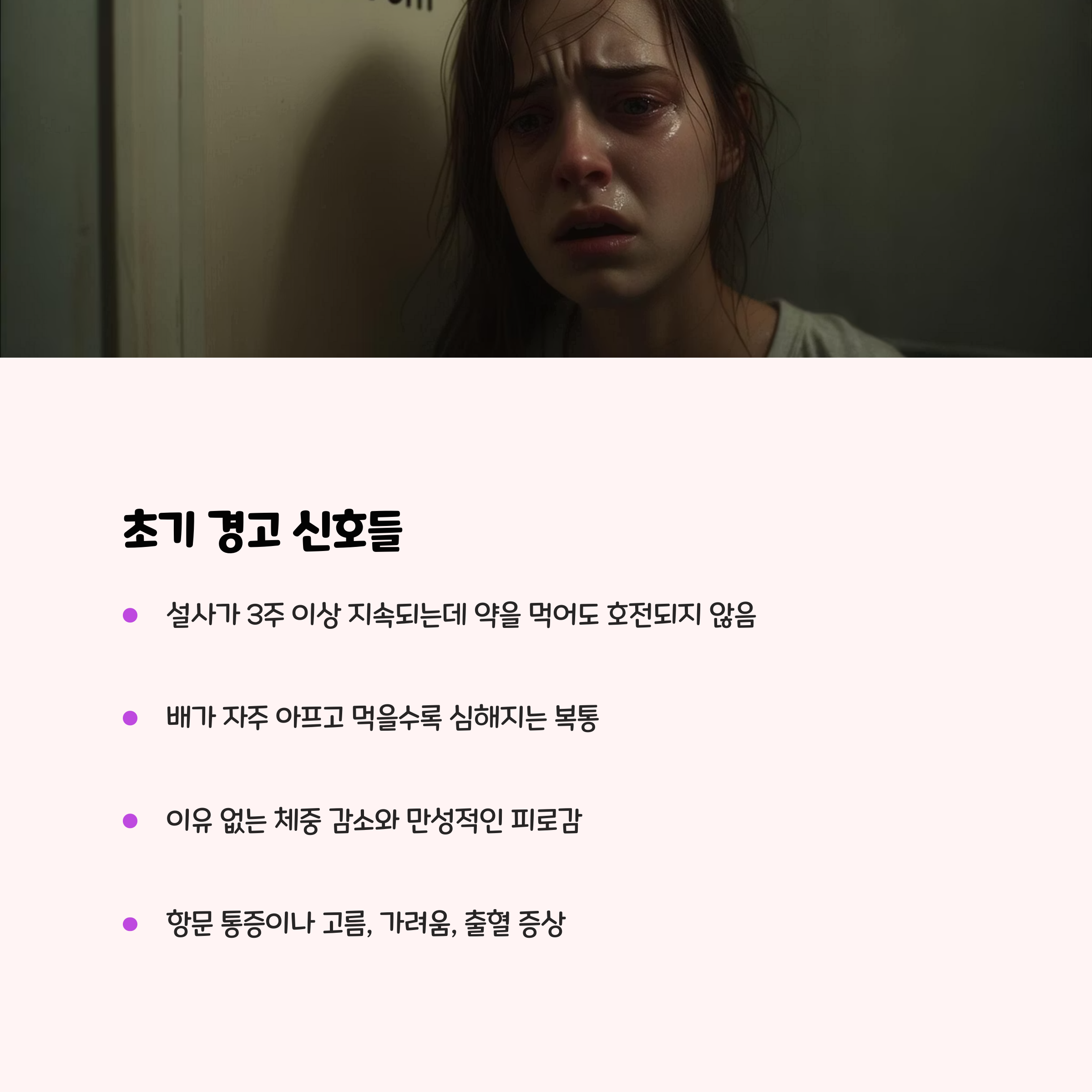 크론병은 초기에 알아차리기 정말 어려운 병이에요. 일반적인 위장 장애와 헷갈릴 정도로 증상이 비슷하거든요. 하지만 몇 가지 '다른 느낌'이 있는 경고 신호가 분명 존재해요. 특히 다음 같은 패턴이 반복된다면 꼭 소화기내과 진료를 받아보시는 걸 추천해요.