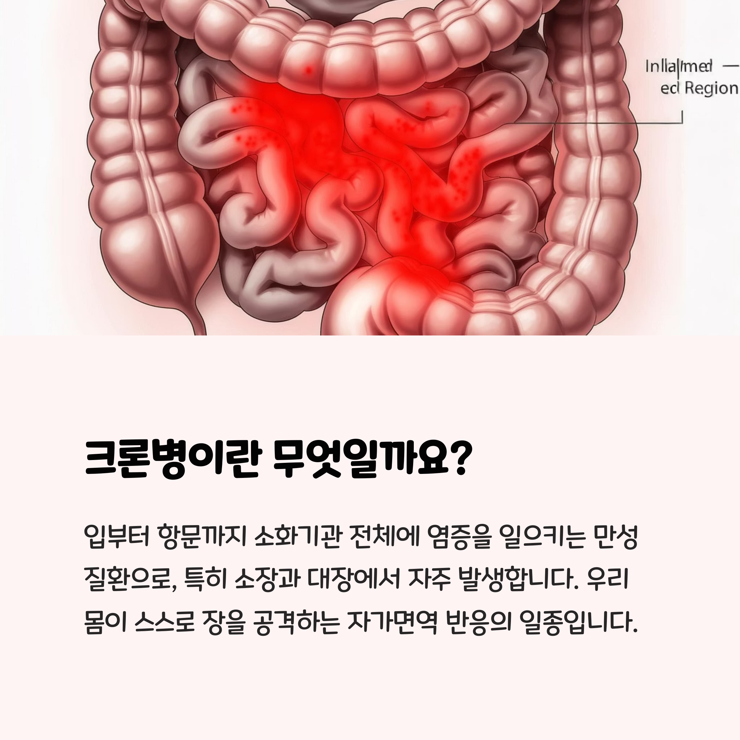 크론병(Crohn's disease)은 입부터 항문까지 소화기관 전체에 염증을 일으킬 수 있는 만성 염증성 장질환이에요. 특히 소장과 대장 부위에서 자주 발생하죠. 이 병은 자가면역 반응의 일종으로, 우리 몸이 스스로 장을 공격하면서 생겨요. 증상이 다양하고 사람마다 양상이 달라 조기 진단이 어렵지만, 증상이 나타나기 시작하면 삶의 질에 꽤 큰 영향을 줍니다. 저도 초반엔 그저 과민성 대장증후군 정도로 생각했었어요.