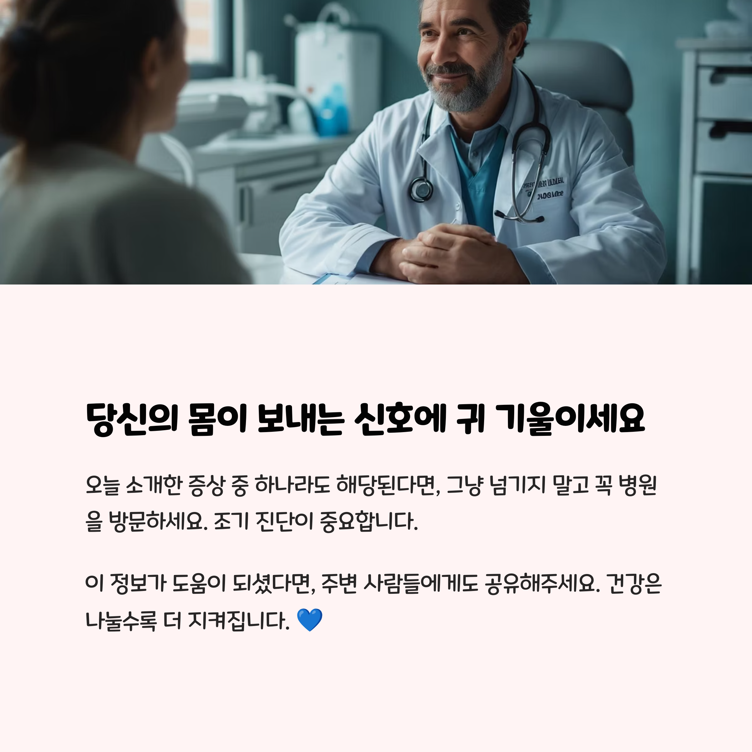 혹시 오늘 소개한 증상 중 하나라도 해당된다면, 그냥 넘기지 말고 꼭 병원 가보세요. 저도 병원 가기 전까지는 그냥 ‘스트레스 때문이겠지’ 하고 참았었는데요, 진단 받고 나니 그동안 제 몸이 얼마나 힘들었는지 알겠더라구요. 우리 몸은 늘 신호를 보내고 있어요. 그 신호, 귀 기울여줘야 해요. 그리고 이 글이 도움이 됐다면, 주위에도 조심하라고 꼭 알려주세요. 건강은 나눌수록 더 지켜지니까요. 😊