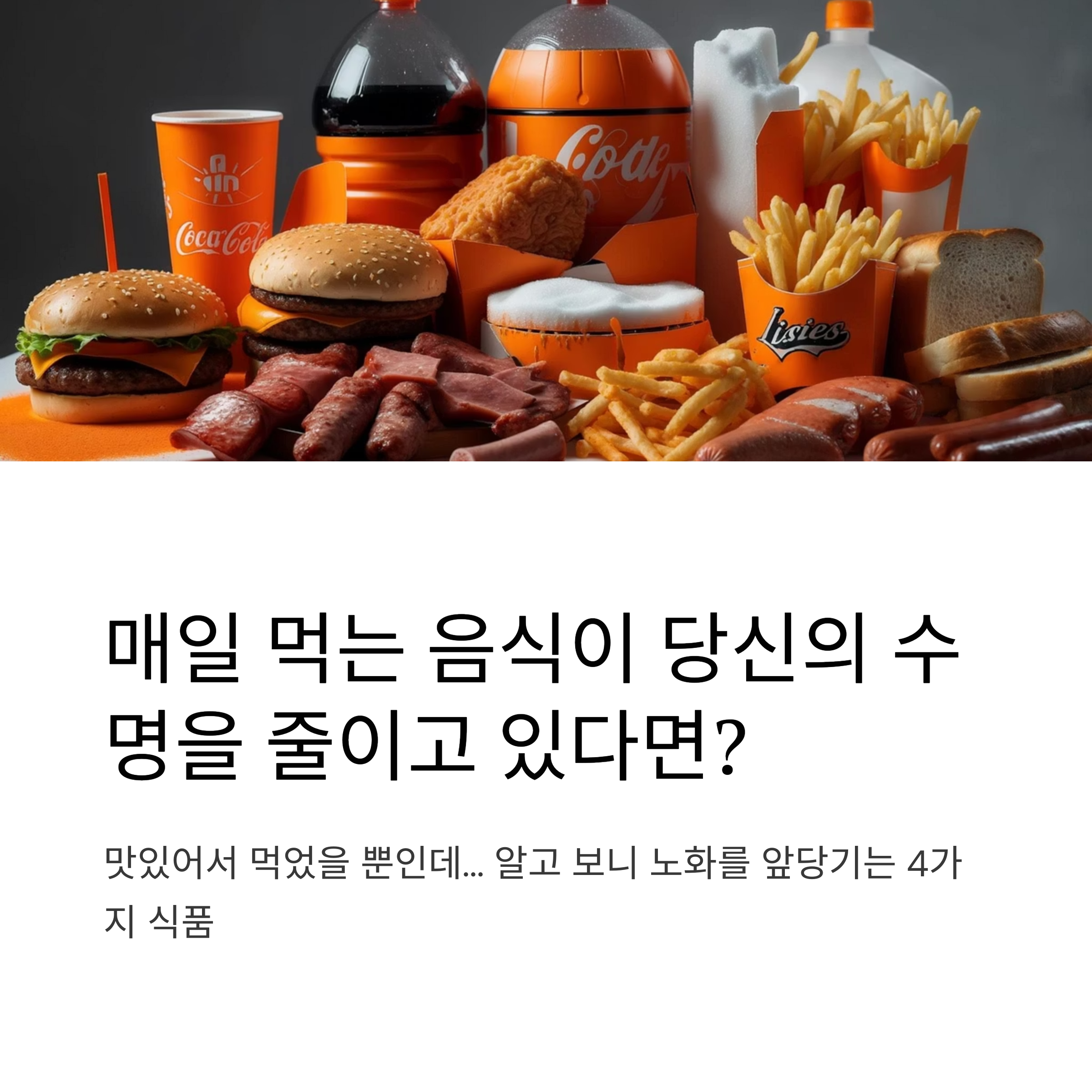 매일 먹는 그 음식, 알고 보면 노화를 앞당기는 주범일 수 있습니다입에 달고, 바삭하고, 속 시원한 그 음식들.하지만 습관처럼 자주 먹는 식품 중 일부는세포 노화를 가속시키고, 심혈관 질환이나 암 발병률까지 높일 수 있다는 연구 결과가 있습니다.단순히 “몸에 안 좋다”는 수준이 아니라,‘수명을 단축시킬 수 있다’고 과학적으로 경고되는 4가지 식품을 소개합니다.먹는 양과 빈도만 줄여도 건강 나이는 분명 달라질 수 있습니다.1. 가공육 (햄, 소시지, 베이컨)가공육은 세계보건기구(WHO)가 1군 발암물질로 분류한 식품입니다.주로 질산염, 아질산염 등 방부제와 색소가 다량 포함돼 있어위암, 대장암, 심장질환의 위험 요인으로 지목됩니다.문제 성분건강 영향아질산나트륨발암물질 형성 (니트로사민)나트륨 과다고혈압, ..